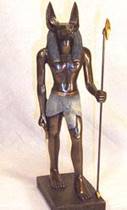 Анубис – бог-защитник и покровитель умерших; его зооморфное воплощение – распластавшийся на брюхе шакал черного цвета или собака, а также человек с головой шакала или собаки. В эпоху Древнего царства («Тексты пирамид») Анубис почитался как главный бог царства мертвых, однако в период Среднего и Нового царств он уступил свое место Осирису, а сам стал богом из окружения Осириса. В царстве мертвых Анубис вводит душу умершего в Зал Двух Истин, где происходит суд над ней, взвешивает его сердце на весах. Анубис играет важную роль при осуществлении погребального ритуала, в процессах бальзамирования и мумифицирования. Культовый центр – г. Кинополь.