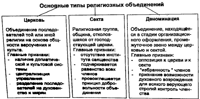 В литературе выделяются следующие типы религиозных объединений: церковь, секта, деноминация. Церковь представляет собой сравнительно широкое объединение, в котором отсутствует постоянное и строго контролируемое членство. Во многих церквах осуществляется деление верующих на священников и рядовых членов - мирян Церковь строго структурирована по «горизонтали» и «вертикали» в соответствии с детально разработанной нормативной системой.
