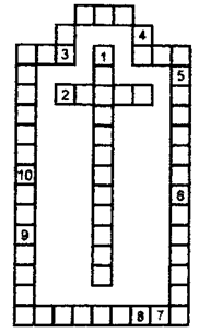 По вертикали: 1.Рождество. 2.Церковь. 3.Распятие. По горизонтали: 4.Троица. 5.Прихожане. 6.Андрей. 7.Псалтырь. 8.Пасха. 9.Евангелие. 10. Иоанн.