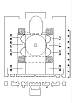 Таким образом, мы имеем две пары экседр, расположенных друг напротив друга, каждая из которых была обрамлена арками, несущими посвятительную надпись. Как видно по субструкциям, наос отделялся от апсиды при помощи стены неправильной формы, которая отдалена от центра фундамента амвона на дистанцию в 9.25 м к востоку. Если же поместить пары экседр на основания фундамента лицом друг к другу, то центры простенков между каждой парой экседр будут удалены от центра амвона на то же расстояние 9.25 м. Далее, удвоив это расстояние, мы получим размер центрального подкупольного пространства: 9.25 х 2 = 18.50 м. Обращает на себя внимание и тот факт, что сумма длин хорд двух экседр, длин их двух внешних простенков и длины арки между ними равна 13.0 м + 1 м + 4.50 м = 18.50 м. Т.е. центральное пространство образовывается двумя парными экседрами, соединенными аркой между ними, расположенными на двух фундаментных полосах так, что центр основания амвона является центром всей композиции и внутреннего подкупольного пространства. В таком случае, западная часть постройки перекрывалась цилиндрическим или крестовым сводом, как в более поздней юстиниановской церкви Св. Софии [20,407].