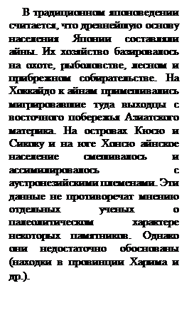 Этническая принадлежность древнейшего населения архипелага еще не окончательно выяснена. В образовании японской народности приняли участие, как уже указывалось, как айны и другие южные племена, так и — позднее — племена монголо-малайского происхождения.