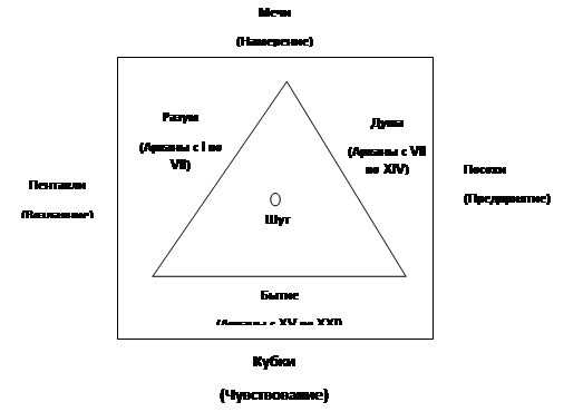 Структуру Таро можно представить как отражение взаимоотношений Бога, человека и вселенной, или иначе - связей между миром идей, сознанием человека и миром физическим. В этой диаграмме в центр помещен малый круг или точка, изображающая человеческую душу, треугольник представляет тройственную сущность Бога, а квадрат символизирует явленный мир. Карты Таро поставлены в соответствие различным частям этого чертежа.