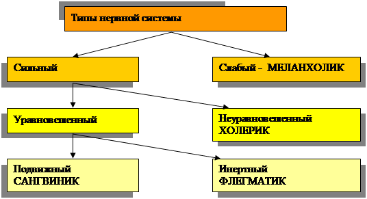 Вообще индивидуально – психические свойства личности определяются совокупностью трех факторов: силы, уравновешенности и подвижности нервной системы/2/. Именно эти факторы определяют, каким человеком ты станешь – уверенным или слабым, спокойным или раздражительным, подвижным или инертным. С точки зрения «бытовой психологии» всех людей можно разделить на 4 типа по совокупности этих факторов.
