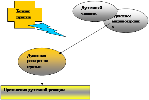 Если даже такому великому мужу Божьему было тяжело побеждать грех, то что и говорить о новообращенном человека – младенце во Христе? Все его реакции, мнения, понятия еще насквозь душевны, а не духовны. Происходящее с ним можно показать на довольно простом рисунке, отражающем душевную реакцию (а откуда у него другая возьмется?) на Божий духовный призыв.