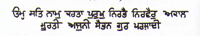 Первая мантра (молитвенная формула или зaклинание), именуемая «Мул Мантра», с которой начинается священная книга сикхов «Ади Грантх», выглядит следующим образом (она написана на пенджаби):