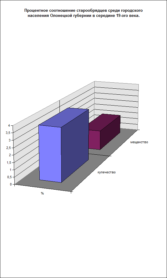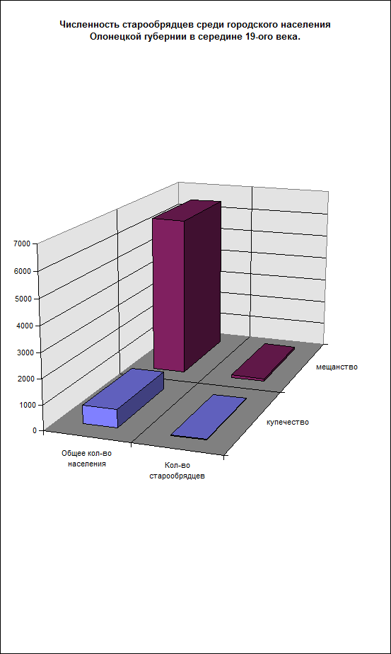 Среди старообрядчества помимо сельского, было и городское население. В Олонецкой губернии основной частью городского населения были мещане и купцы. Проведя аналогичные расчеты, я прихожу к выводу, что основной частью старообрядчества среди городского населения являлись купцы. Как известно, купечество - это более зажиточный слой, чем мещанство.