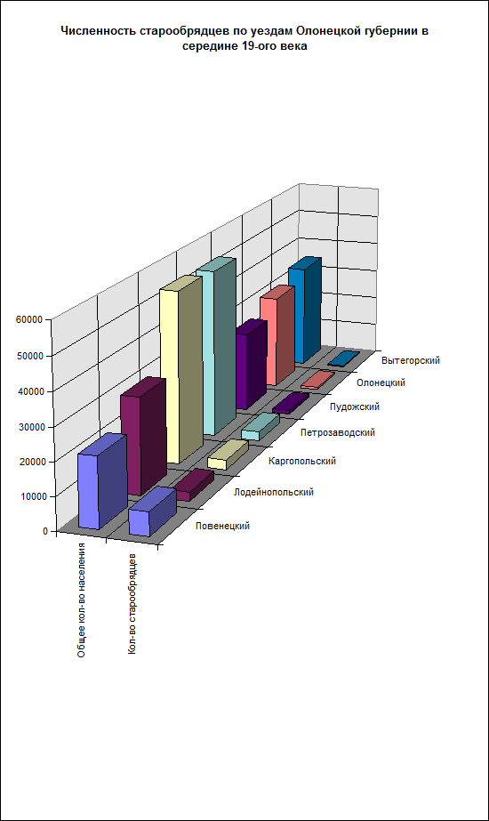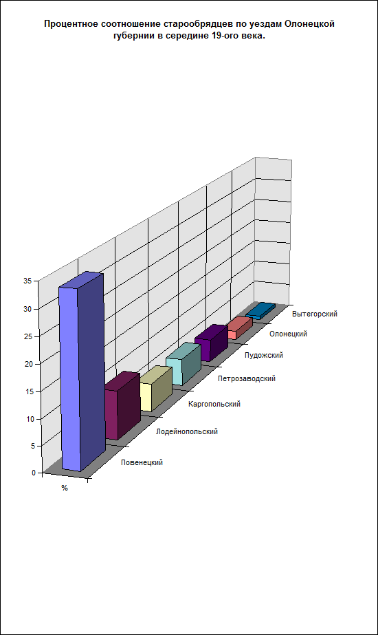 Самый высокий процент старообрядцев - 33,4* был в Повенецком уезде. Такое большое количество староверов среди населения связано с тем, что Повенецкий уезд расположен в самой глуши Олонецкой губернии. Кстати, с конца 17-ого века на этой территории находился центр беспоповщинского согласия - Выгорецкая пустынь.