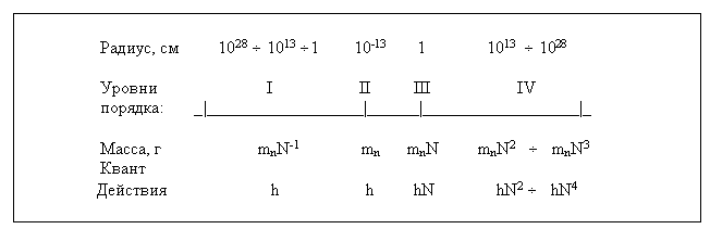Рис 3. Схема уровней порядка мира. Радиус - размер типичного объекта уровня;