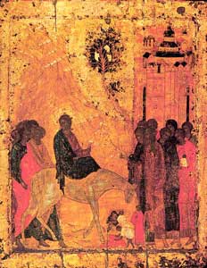 "Для чего, - спрашивает святой Епифаний Кипрский, - Христос, ходив прежде сего пешком, ныне и только ныне воссел на животное? Дабы показать, что Он вознесется на крест и прославится на нем. Что знаменует "противоположная весь"? Строптивое расположение духа выгнанного из рая человека, к коему Христос послал двух учеников, то есть два Завета, Ветхий и Новый. Кого означает ослица? Без сомнения, синагогу, которая под тяжким бременем влекла жизнь и на хребте которой когда-нибудь воссядет Христос. Кого означает осленок? Необузданный языческий народ, на которого никто не садился, то есть ни закон, ни страх, ни Ангел, ни пророк, ни Писание, но только Один Бог Слово".