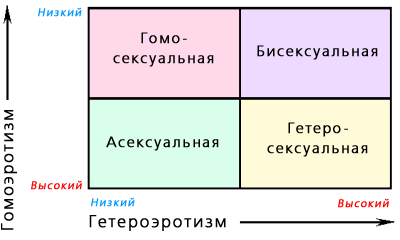 Согласно этой модели, у бисексуалов высокий уровень как гомоэротизма, так и гетероэротизма, у гетеросексуалов высокий уровень гетероэротизма и низкий уровень гомоэротизма, у гомосексуалов низкий уровень гетероэротизма и высокий уровень гомоэротизма, а индивидуумы с низкими уровнями обоих показателей будут асексуальными. До настоящего времени ортогональная модель сексуальной ориентации, разработанная Стормзом, применялась в сексологических исследованиях не столь широко, как различные модификации шкалы Кинзи.
