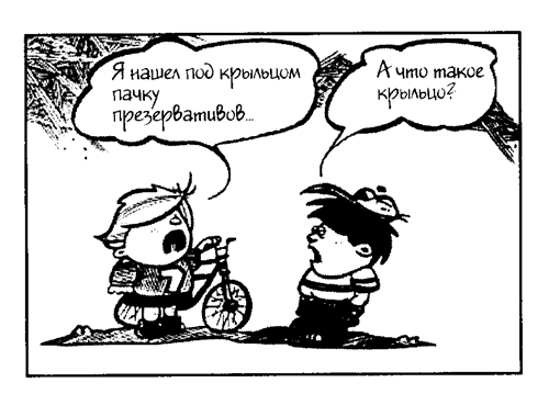 По замечанию Мани (Money, 1980), если ребенку недоступна простая, откровенная информация о поле, основным источником полового образования становятся соответствующие анекдоты. Поскольку даже самый маленький ребенок быстро узнает разницу между "чистой" и "грязной" шуткой, это ведет к выработке представления о сексе как о чем-то "непристойном".