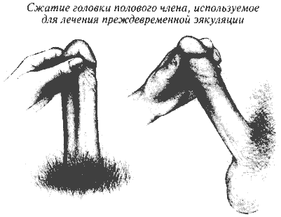 При лечении преждевременной эякуляции наш метод общения с обоими партнерами особенно важен, поскольку это расстройство может оказаться на самом деле более неприятным для женщины, чем для мужчины. В этих случаях, помимо обсуждения физиологии эякуляции, врачи вводят специальный метод, называемый "методом сжатия", который помогает восстановить эякуляционный рефлекс. Когда начинаются прикосновения к гениталиям, женщина периодически сжимает половой член. При этом, как показано на рисунке, женщина кладет большой палец на уздечку полового члена, а указательный и средний пальцы - на венечную борозду и под нее, на противоположный стороне члена. В течение примерно 4 с она сильно сжимает член, а затем резко отпускает его. Сжатие всегда следует производить спереди назад, а не от одной стороны к другой. Женщина должна делать это подушечками пальцев, чтобы не ущипнуть или не поцарапать половой член ногтями. По непонятным причинам метод сжатия снижает настоятельность эякуляции (кроме того, это воздействие может привести к временному частичному ослаблению эрекции). Его не следует использовать, однако, в момент, когда эякуляция становится неизбежной, а надо начинать на ранних стадиях игры с гениталиями и продолжать с перерывами в несколько минут. Сжатие можно производить независимо от того, находится ли половой член в эре-гированном или вялом состоянии, но сила давления должна соответствовать уровню эрекции.