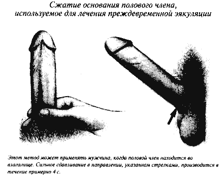 Сжатие полового члена у основания следует применять только во время полового акта. Начинать его должен мужчина, так как после полного введения полового члена ему по чисто анатомическим причинам легче добраться до основания члена и ему же, несомненно, гораздо легче судить об уровне своего полового возбуждения, чем женщине. На первые шесть месяцев после начала применения метода сжатия мужчине рекомендуют отказаться от всяких рискованных экспериментов, т.е. попыток выяснить, насколько он может приблизиться к состоянию неизбежности эякуляции до начала сжатия. Метод сжатия гораздо более эффективен, если начать применять его до того, как цикл половой реакции достигнет стадии плато.