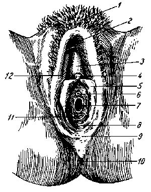 Наружные половые органы девственницы 1. Лобок 2. Переднее кожное сращение 3. Крайняя плоть клитора 4. Головка клитора 5. Малая половая губа 6. Отверстие мочеиспускательного канала 7. Вход во влагалище 8. Предверие влагалища 9. Заднее кожное сращение 10. Задний проход (анус) 11. Девственная плева 12. Большие половые губы |
