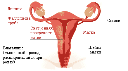 Матка — непарный полый мышечный орган, расположенный в малом тазу между мочевым пузырем и прямой кишкой. Мочевой пузырь находится спереди от матки, прямая кишка — сзади. Матка обычно имеет грушевидную форму. В ней различают дно, тело, перешеек и шейку. Наиболее массивная часть — тело матки — суживается книзу и переходит в шейку, нижний отдел которой выступает в просвет влагалища (влагалищная часть). Влагалищная часть шейки матки доступна осмотру при гинекологическом исследовании с помощью влагалищных зеркал. Полость тела матки на разрезе имеет форму треугольника, в верхние углы которого открываются устья маточных труб, в нижний — внутреннее отверстие канала шейки матки (внутренний маточный зев). Наружное отверстие канала шейки матки (наружный маточный зев) открывается во влагалище.