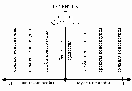 В связи с этим следует считать, что естественный отбор людей в настоящее время идет по пути выживания людей преимущественно с более сильной половой конституцией. При этом происходит как бы поляризация человеческого общества на мужчин и на женщин с возможно более сильной половой конституцией (см. иллюстрацию на рис. 1).