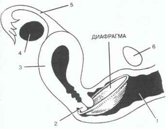 (1. Расположение диафрагмы во влагалище. 2 - шейка матки; 3 - тело матки; 4 - яичник; 5 - маточная труба; 6 - лобковая кость.)