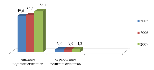 На рисунке 1 видно, что в 2005 году было удовлетворено 49,6 тыс. исков о лишении родительских прав, то в 2007 году их число составило уже 56,1 тыс. (в 2006 году 50,8 тыс.). Число детей, отобранных у родителей, лишенных родительских прав, в 2007 году достигло 65,2 тыс., увеличившись по сравнению с 2005 годом на 5,6 тыс., человек, или на 9,3 %. Растет и численность детей, родители которых ограничены в родительских правах: в 2007 году было учтено 4,3 тыс., таких детей, тогда как в 2005 году 3,6 тыс., в 2006 году - 3,5 тыс. детей. Таким образом, мы видим актуальность и необходимость осуществления профилактической деятельности в отношении родителей, ненадлежащим образом выполняющих родительские обязанности на уровне государства.