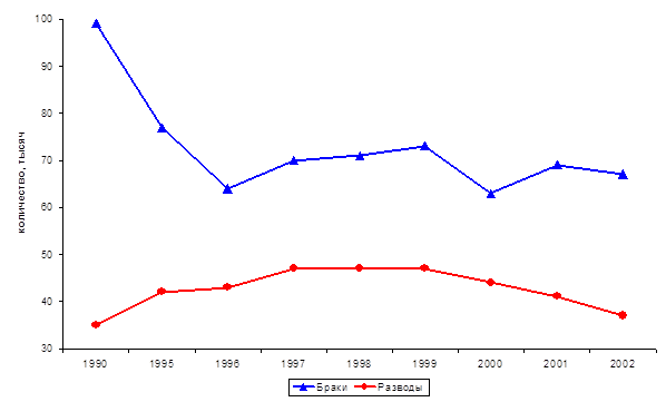 Так, статистические данные свидетельствуют о том, что в республике распадается более 2/3 всех заключенных браков (для сравнения отметим, что в начале 90‑х годов распадалась только 1/3 часть) [75, с. 67] (см. рис. 3.1).