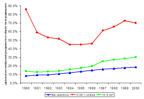 Существенно снизились социально‑политические, культурные, досуговые интересы молодежи, уровень ее общей культуры. Часть молодежи самоизолируется, уходит «в себя», в социальный вакуум, а это ограничивает ее способность активно включаться в новые общественные отношения, искать различные формы самозащиты и т.д. А главное – социальная бездеятельность рождает социальную безответственность. В качестве негативного примера можно сослаться на такое явление, как внебрачная рождаемость среди несовершеннолетних, доля которых в общем объеме внебрачных рождений в стране весьма велика (см. рис.3.5).