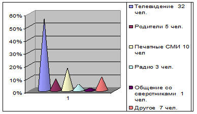В ходе беседы (Приложение №2) мы выявили, что подростки все больше смотрят не центральные, а "малые" сетевые каналы. По результатам анкет мы выяснили, что телевидение является не только главным источником информации о текущих событиях, но и, главным источником знаний о мире, представлений о жизни вообще. Они смотрят телевизор больше днем, меньше - вечером, и мало после двадцати трех часов. Предпочитают такие телеканалы как "Россия", "ТНТ", "МУЗ - ТВ", "СТС", "Рен ТВ" "ДТВ". Это связано с тем, что в дневное время на этих каналах показывают подростковые сериалы, программы для подростков и юношества. Они смотрят такие передачи как "Сто к одному", "В мире животных", "Необъяснимо, но факт", "Битва экстрасенсов", "Интуиция", "Умники и умницы", "Кто хочет стать миллионером", "Царь горы", многие смотрят "Новости" "Вести - спорт". И конечно, познавательные, образовательные программы - на канале "Культура". Много сейчас замечательных фильмов показывают про природу и её законы, про то, как формировался человек и всё живое.