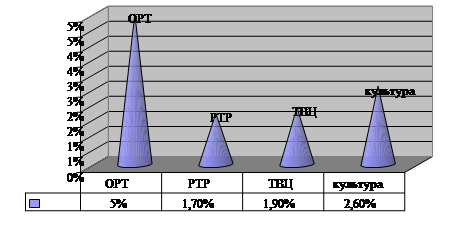 Передачи для подростков по отдельным телеканалам составили за этот период: ОРТ - 5%, РТР - 1,7%, ТВЦ - 1,9%, Культура - 2,6%.