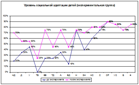 Результаты диагностики детей-сирот в начале и конце экспериментальной работы показали позитивную динамику по многим симптомокомплексам. Так, у детей экспериментальной группы значительно снизились показатели по шкалам "недоверие к новым людям", "тревожность по отношению к взрослым", "враждебность к детям", "эмоциональное напряжение" и "ассоциальность". Возросло количество детей с более высоким уровнем социальной адаптации, что наглядно видно на рис.2.1