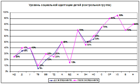 Применение игровых технологий в социально-педагогической деятельности с детьми-сиротами, проживающими в условиях школы-интерната, позволили повысить уровень их социальной адаптации, о чем свидетельствуют показатели таблицы 2.3. В нее внесены результаты, полученные с помощью "Карты наблюдения" Д.Скота после окончания формирующего эксперимента.