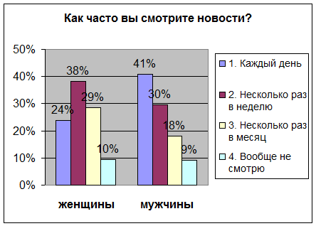В возрасте 16–18 лет почти треть вообще не смотрит новости (28%), зато в 25–29 лет нет таких, кто бы ни смотрел новости, и почти половина (45%) смотрят новости каждый день.