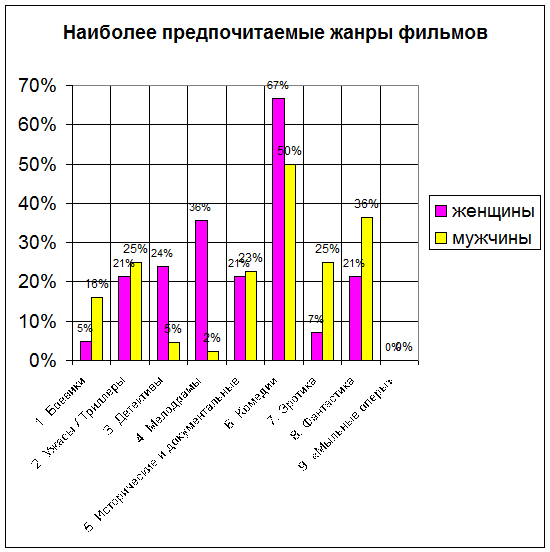 Так, по данным исследования наиболее предпочитаемым жанром в исследуемых группах молодежи являются комедии. Этот жанр по распространенности выбора оказался на первом месте, как у юношей, так и у девушек, он лидирует среди всех возрастов молодежи. Такую популярность комедийного жанра можно объяснить тем, что телевидение для молодежи является в первую очередь средством развлечения. А вот второе место разделилось в зависимости от пола. Девушки выбирают мелодрамы, а юноши фантастику. Жанр мелодрамы имеет достаточно высокий рейтинг у девушек и низкий у мужчин. Оба жанра имеют динамику развития, от менее предпочитаемых, к более предпочитаемым, в зависимости от возраста. Третье место заняли ужасы и триллеры (23%). Популярность фильмов ужасов для значительной части молодежи вполне понятна: в данном возрасте у людей существует потребность в острых ощущениях. Рейтинг триллеров не сильно зависит от пола, хотя мужчины предпочитают такие фильмы чуть больше. Однако большинство триллеров, как известно, включает сцены насилия, поэтому их популярность вызывает озабоченность. Чуть отстают от триллеров исторические и документальные фильмы (22%), следующим по популярности жанром фильмов являются эротика (16%). Следует сказать, что проблема взаимосвязи эротики с агрессивным поведением зрителей также является достаточно актуальной. Так, проведенные Р. Бероном исследования показали, что такая связь существует, однако она не является линейной. В частности, было выявлено, что умеренное сексуальное возбуждение, вызванное продукцией эротического содержания, уменьшает агрессию. Однако откровенно сексуальные сцены провоцируют сильное возбуждение, повышают вероятность проявления агрессивного поведения. Дальнейшие исследования показали, что данная закономерность действует как в отношении мужчин, так и в отношении женщин. В целом, на данный момент выделяют две основные модели влияния эротических сцен на зрителя. Согласно первой модели, пересмотр фильмов эротического содержания вызывает катарсический эффект, позволяет реализовать вытесненные сексуальные фантазии. Согласно другой модели, просмотр эротических сцен стимулирует сексуальную агрессию.