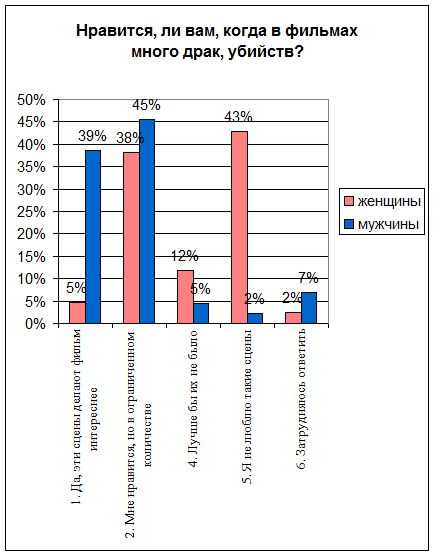 Боевики, как ни странно, пользуются наименьшей популярностью, причем предпочтение подобным фильмам отдают в основном мужчины. Таким образом, можно было бы сделать вывод, что молодежь в основном не любит смотреть сцены насилия, но это этот вывод полностью опровергает ответ на следующий вопрос.