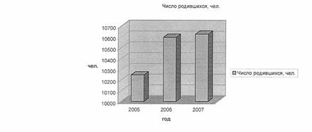 Коэффициент рождаемости. В ходе расчетов было выявлено, что рождаемость в регионе повышается. Численность родившихся в 2007 по сравнению с 2005 годом увеличилась на 379 человек, или на 3,6%, в 2007 году по сравнению с 2006 годом она увеличилась на 30 человек, или на 0,2%. Таким образом, если сравнивать 2007 год с 2005 годом и 2006 год с 2005 годом, то наблюдается увеличение числа родившихся.