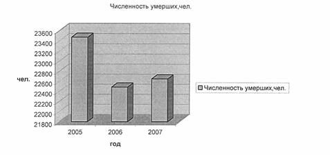 Коэффициент смертности. Как видно из рассчитанных данных, смертность в 2007 году по сравнению с 2005 годом сократилась, коэффициент смертности тоже уменьшился, но все же смертность продолжает оставаться на очень высоком уровне и намного превосходит рождаемость, Численность умерших в 2007 по сравнению с 2005 годом снизилась на 823 человек, или на 3,6%, а в 2007 году по сравнению с 2006 годом она повысилась на 163 человек, или на 0,7%.