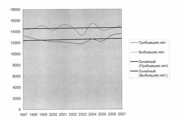 Рисунок 3.30 - динамика механического прироста населения и тренды, характеризующие выбывшее и прибывшее население за 1997-2007 гг.
