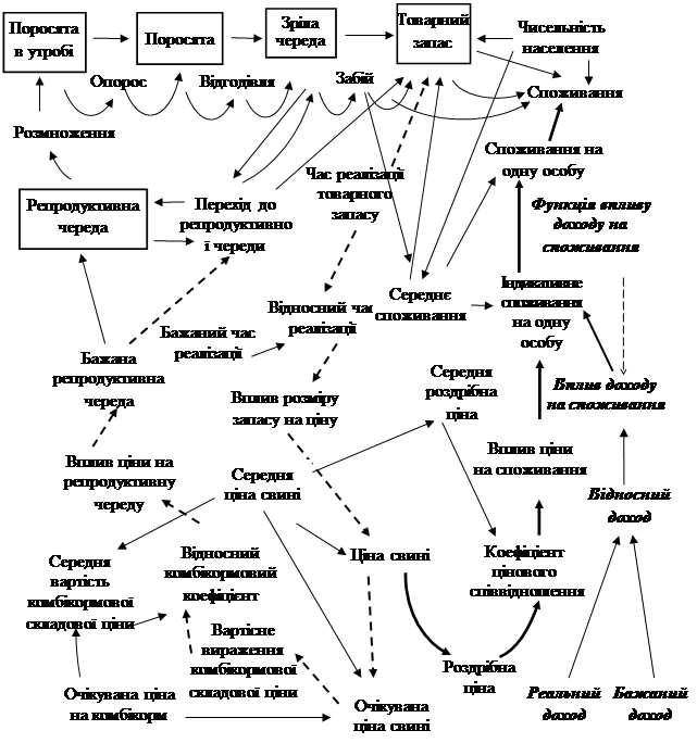 Построена концептуальная модель воспроизводства на рынке продукции животноводства путем модификации и дополнения базовой модели динамики циклов товарного производства Д.Л.Медоуза с последующей ее адаптацией к условиям украинского рынка, что позволило провести анализ взаимосвязей между элементами рынка животноводческой продукции в Украине.