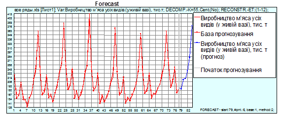 Рис. 4. Прогноз виробництва м’яса усіх видів (у живій вазі) в Україні на друге півріччя 2007 р. з базою прогнозування 78 місяців.
