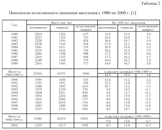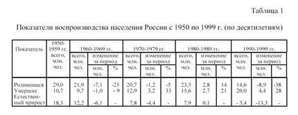 Сначала 90-х годов социально-экономические процессы в обществе сопровождаются неблагоприятными изменениями в демографической ситуации в России: снижением и до этого периода времени невысокого уровня рождаемости, увеличением смертности и с 1992 г. нарастающей естественной убылью населения, которую не компенсирует миграционный прирост. Постоянное население РФ на 1 октября 2001 г. насчитывало 144,2 млн. чел. В 1991 г. его среднегодовая величина составляла 148,6 млн. чел.