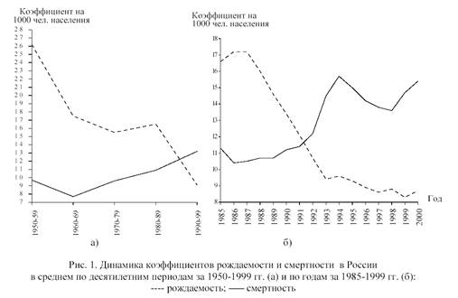 После снижения смертности в 1960-1969 гг. по сравнению с предыдущим десятилетием почти на 1 млн чел. (-9%), во все последующие десятилетия отмечен рост смертности по сравнению с предыдущим десятилетием: за 1970-1979 гг. на 3,2 млн. чел. (+33%), 1980-1989 гг. – на 2,7 млн. чел. (+21%) и за 1990-1999 гг. – на 4,4 млн. чел. (+29%). Особенностью последнего десятилетия явилось то, что впервые во второй половине ХХ столетия естественный прирост сменился убылью, составившей за 10 лет более 5,4 млн. чел., кумулятивно вобравшей в себя и крупное снижение рождаемости (38%), и значительный прирост смертности (28%).