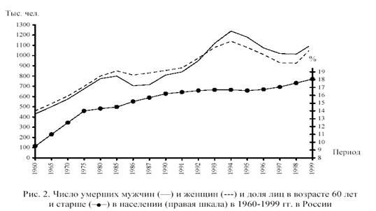 Значительный рост смертности в России в 90-е годы не сопрягается с параллельным процессом постарения населения. Средний возраст населения России во второй половине ХХ века был ниже, чем в любом регионе Европы и Японии и лишь немного меньше, чем в Северной Америке. Сопоставление общей динамики смертности мужчин и женщин с динамикой доли лиц в возрасте 60 лет и старше за период с 1960 по 1999 г. показывает, что с 1960 по 1975 г. эти показатели изменялись параллельно (рис. 2) [1].
