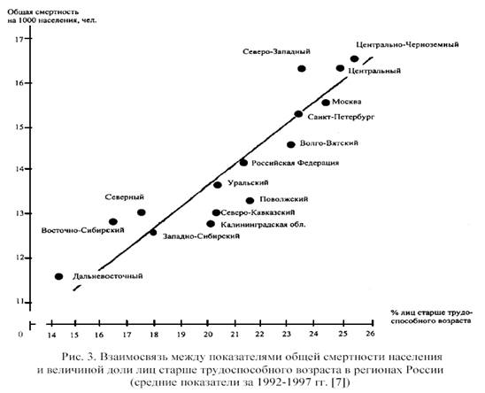 В регионах страны наибольшая общая смертность населения отмечается там, где наиболее высока доля лиц старших возрастов (рис 3). В «пиковом» 1994 г. наибольший прирост смертности по сравнению с 1990 г. был в Северном районе (63%), в Восточной Сибири и на Дальнем Востоке (55%), в Калининградской области (51%); наименьший – в Северо-Кавказском и Центрально-Черноземном районах (25%). В 1999 г. наибольшая динамика смертности характерна для тех же регионов, где был наибольший ее прирост в 1994 г. Наименьший прирост отмечался в Санкт-Петербурге, Москве, Северо-Кавказском и Центрально-Черноземном районах.