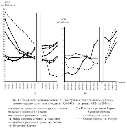 Если рассмотреть динамику демографических показателей стран с разным уровнем социально-экономического развития за период с 1950 г., то на фоне мировой тенденции снижения общей смертности населения динамика показателей России (как и ряда стран Восточной Европы) выглядит аномальной.