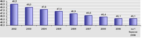 За січень-лютий 2009 року населення України зменшилось на 41,9 тис.осіб і на 1 березня 2009 року його кількість становила 46,1 млн. осіб. У порівнянні з 2002 роком, кількість населення скоротилася на 2,4 млн.осіб, щороку зменшуючись на 0,2-0,5 млн.осіб (рис 1.1).[24]
