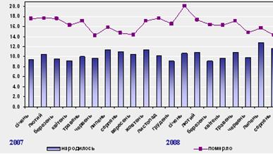 Підвищення рівня народжуваності в Україні в останнє п’ятиріччя після обвального його падіння протягом 12 років має яскраво виражений „компенсаційний характер” - у цей період було реалізовано народження дітей (причому переважно первістків), які були відкладені у найтяжчі роки соціально-економічної кризи. Збільшенню загального числа народжень почасти сприяла і дія „демографічної хвилі” - вступ у дітородний вік більш численних поколінь жінок народжених на початку – у середині 1980-х років. Для порівняння: з 2007 по липень 2008 року кількість померлих зменшилась на 2,1 тис.осіб, а кількість новонароджених зросла на 4,5 тис.осіб (рис.1.3).