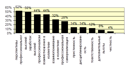 – «удовлетворяют более чем» – морально-психологический климат в коллективе, шансы профессиональной самореализации и роста по службе;