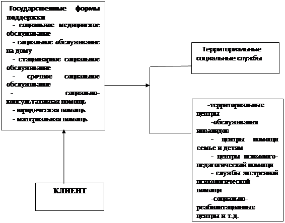 Развитие государственной социальной политики в современных условиях требует новых механизмов, форм и методов ее реализации, основанных на оказании населению необходимого комплекса прямых социальных услуг. В соответствии с концепцией развития социального обслуживания населения РФ (1993 год), одним из важнейших звеньев этого механизма является создание системы социального обслуживания, обеспечивающей разнообразные формы социальной работы с различными категориями населения на территориальном уровне. Она должна включать в себя комплекс разнообразных целевых услуг различным социальным группам, находящимся в зоне риска и нуждающимся с учетом новых социальных реалий в общественной поддержке, помимо той, которая предоставляется централизованно.