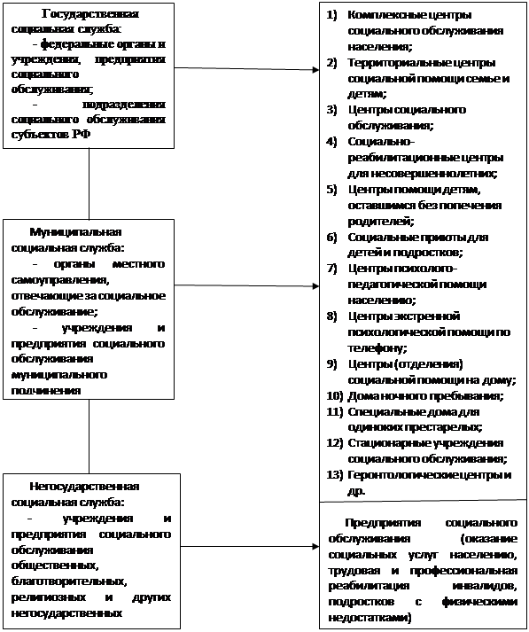 К государственной социальной службе относятся учреждения и предприятия социального обслуживания, органы исполнительной власти РФ и субъектов РФ, в компетенцию которых входит организация и осуществление социального обслуживания.