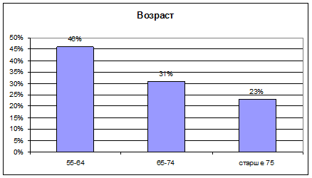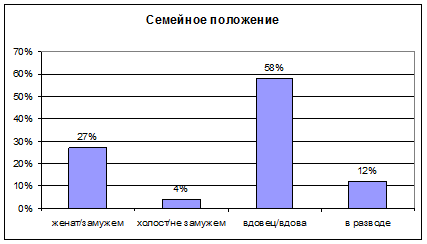 Среди пожилых людей во всем мире гораздо больше женщин, чем мужчин [18, с.34]. Согласно Всероссийской переписи населения 1989 г. на 1000 женщин в возрасте 60-64 лет приходилось 633 мужчины, на 1000 женщин в возрасте 65-69 лет - 455 мужчин, а на 1000 женщин в возрасте 70 лет и старше - 236 мужчин. Десять лет спустя эта тенденция не изменилась.