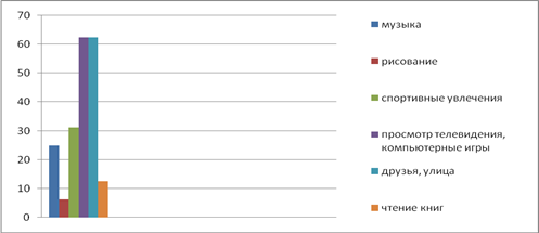 При выявлении интересов подростков, по мнению родителей, телевидение, компьютерные игры и прогулки с друзьями на улице оказываются в «лидерах» увлечений (62,5%); немного меньший интерес уделяется спорту (31,25%); четверть подростков проявляет интерес к музыке (25%); чтению книг, по данным анкет, уделяет внимание 12,5% подростков, рисование же увлечение 6,25% опрошенных.
