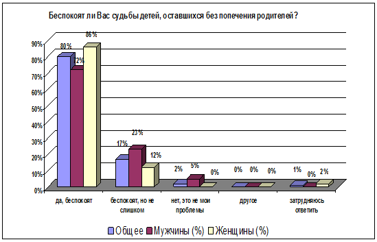 Для выявления личных позиций по проблеме сиротства респондентам был задан вопрос: «Беспокоят ли вас судьбы детей-сирот?» (Приложение 3).Общий уровень обеспокоенности югорчан высок - 80%. Необходимо отметить, что в наибольшей степени озабоченность данной проблемой характерна для женщин (86%), что объясняется их эмоционально-психологическими качествами, отзывчивостью, 5% опрошенных мужчин выбрали среди предложенных ответ «нет, это не мои проблемы».
