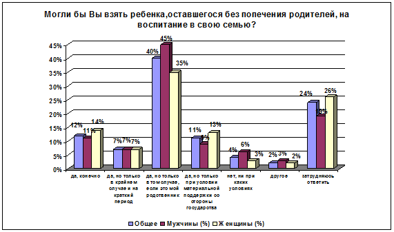 Но можно предположить, что беспокойство носит скорее абстрактный характер и не связывается с личной готовностью к реальному действию. Об этом свидетельствуют ответы на последующий вопрос: «Могли бы Вы взять в свою семью ребенка, оставшегося без попечения родителей» (Приложение 4).